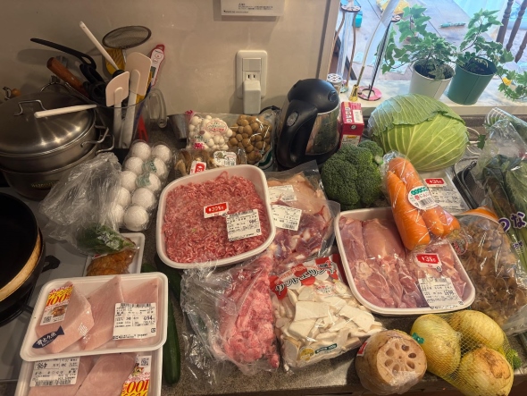 用意したのは、数日〜1週間くらいかけないと消費しきれないようにも見えるほどの、調理台からあふれるほどの大量の食材です。これを3時間で調理できるんだ……!