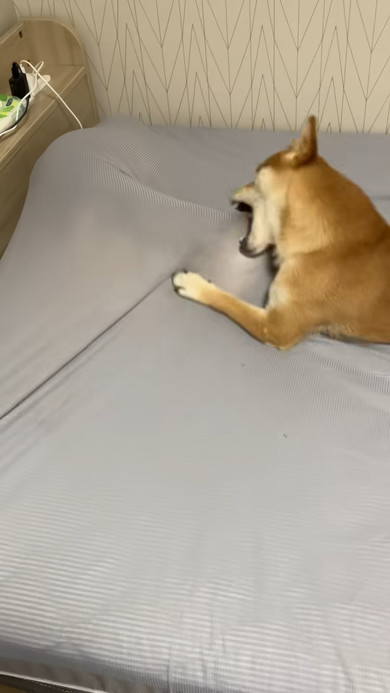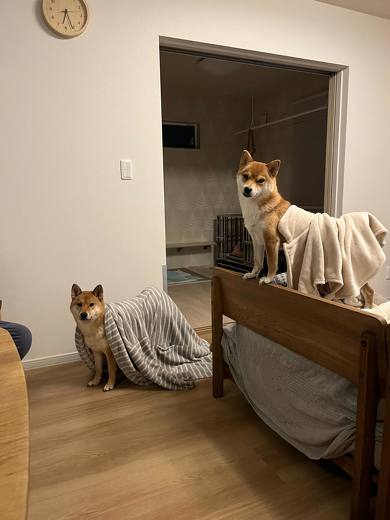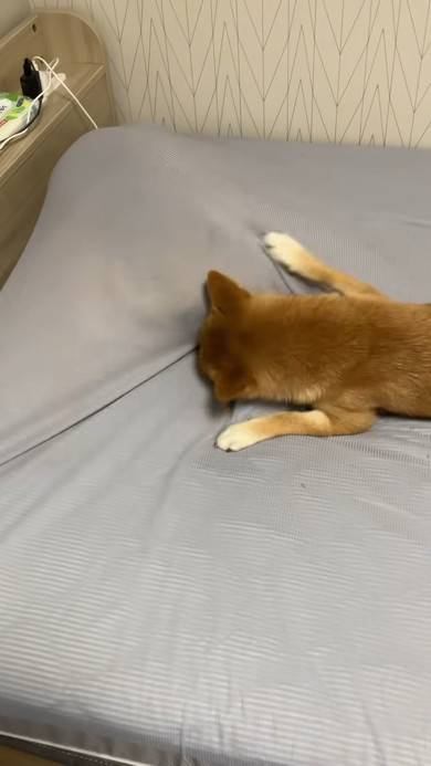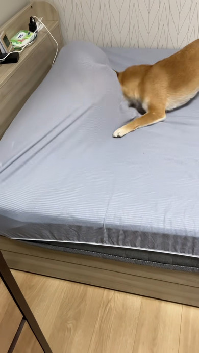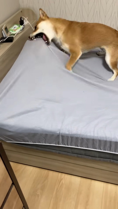 yamazakiさんが今回投稿したのは、ベッドのシーツ交換の様子です。本来なら1分で終わる作業のはずでしたが、新しいシーツに愛犬2匹が大興奮。