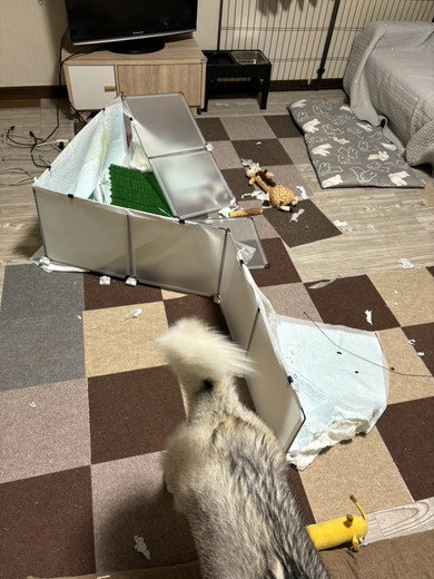しかしそんなトイレも完全崩壊の一途をたどることになりました。さ、最強おトイレがー! 無残な姿になり果てたトイレを見た飼い主さんは「えーっと?? ……誤飲・怪我無し!! よし…!!」という言葉を残しています。トイレトレーニングはなかなかハードルが高いものですが、福丸くんにはぜひ乗り越えていってほしいですね!