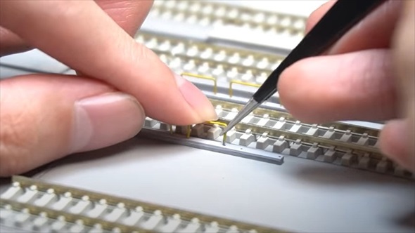 次に取り掛かったのは線路を組み立てる作業です。印を付けたグレーの板に線路のパーツを貼り付けていきます。驚いたのは線路の脇にある柵を作る工程。ホチキスの針を1本ずつに分けて、丁寧に接着していきます。
