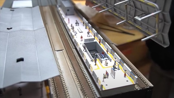 ベンチ、自販機、看板などを置いていき、人物のパーツを配置したら、見慣れたホームの光景に。取り外し可能な屋根のパーツには、リアルな看板や貼り紙、電気の配線が仕込まれています。