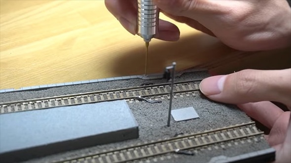 線路の周りにジオラマ用の砂利をまき、筆でならすと線路っぽいリアルさが。まいた砂利は接着剤で固めておきます。