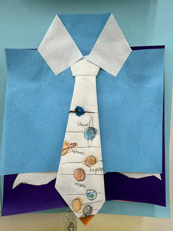 息子さんは水色の紙をチョイスし、襟とネクタイを白で表現。オレンジで塗ったネクタイの先端を太陽に見立て、水金地火木……と、惑星を下から順に配置しています。