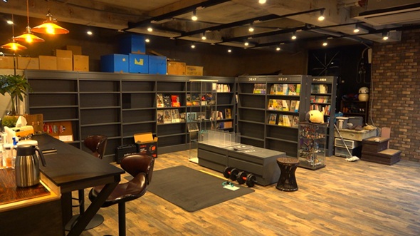 不要な物を撤去したら、コの字型のデスクや蔵書を全て陳列できるような壁一面の巨大本棚を作成。お茶やコーヒーを入れるためのミニキッチンとバーのような雰囲気のカウンター、書店で使われる業務用本棚なども配置し、妻の理想を詰め込んだ空間が完成しました。