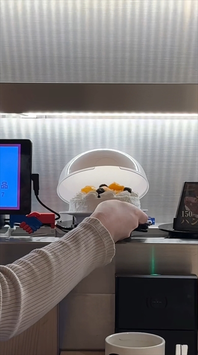 小型ディスプレイも一緒に流れてきており、「おめでとう」と祝福メッセージが表示されています。パレードの最後尾には、中身が見えないように蓋がついた1皿が。蓋がゆっくり開くと、フルーツがたっぷり載ったホールケーキが登場しました。祝われた友人は、大笑いして驚いた様子。ステキなサプライズですね。