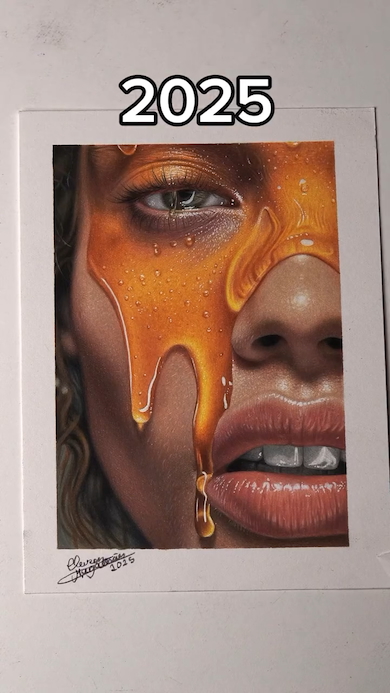 その後も進化は続き、2020年のドウェイン・ジョンソン、2022年のハリー・ポッター、2023年のホアキン・フェニックス版ジョーカーなどは写真のようにリアル。2025年の作品は女性の顔にハチミツが垂らされたもので、単に写実的なだけでなく神秘的な力強さを感じます。迫力もすごい……!