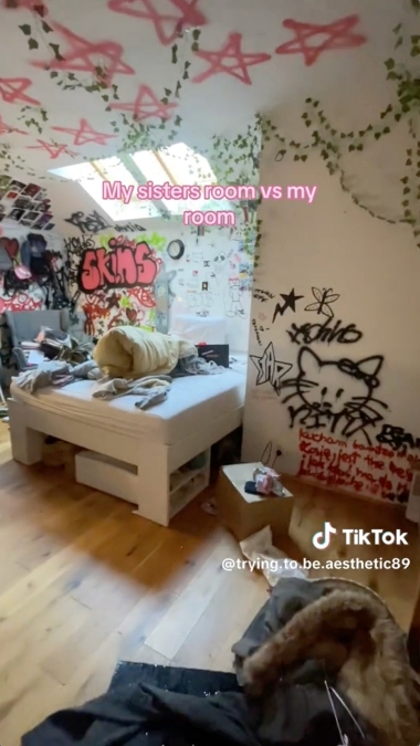 動画は、投稿者の姉妹の部屋から始まります。なんと真っ白い壁や天井にはスプレーで描いたと思われる落書きだらけ! イラストや文字が所狭しと描かれています。床には服や物が散乱していて、天井からは人形らしきものがぶら下がっています。個性たっぷりのにぎやかすぎる部屋だ……!