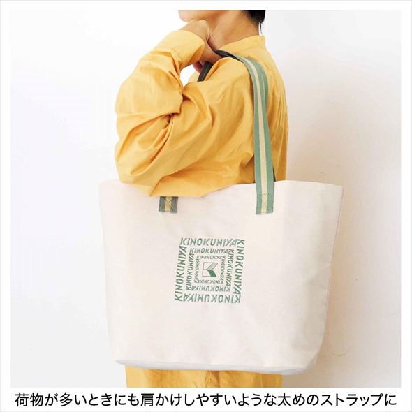 サイズはおよそ高さ31.5×幅46.5×マチ14.5センチ。ナチュラルなキャンバス風の生地にグリーンの刺しゅうロゴをあしらい、持ち手にもグリーンを配して初夏の装いに合わせやすいデザインになっています。