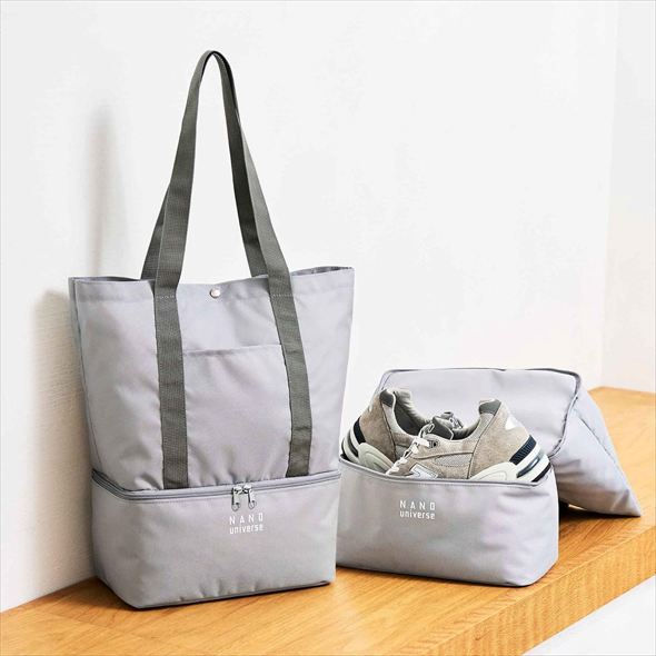 ファスナーで上下2層に仕切られており、上の層はA4ファイルが横に入るサイズ感。下の層にシューズ(28センチまで対応、ただし種類による)や着替えを入れてジムに行ったり、上の層に書類を、下の層にお弁当を入れて仕事に行ったり、といった活用ができそうです。