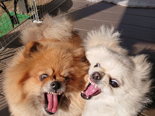 明るい空間でじゃれ合う2匹のワンちゃん。元気いっぱいの様子ですが、大きく開いた口と見開いた目が、すでにちょっぴり怖い雰囲気を漂わせています。