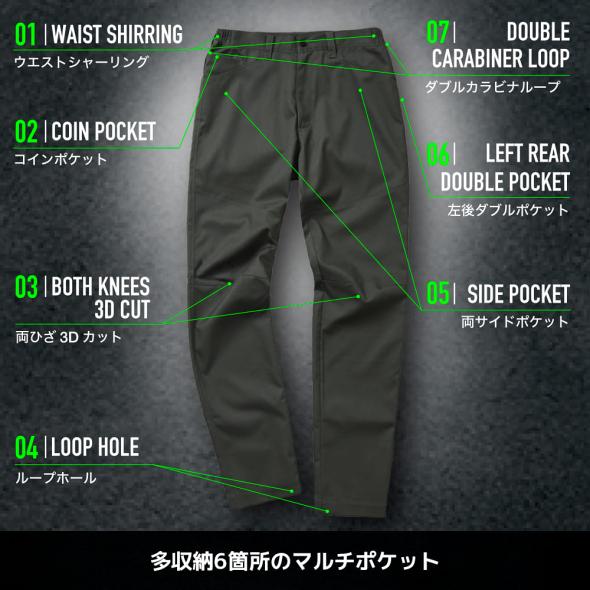機能も充実しており、小物を下げやすい「ダブルカラビナループ」やウエスト部分の「シャーリング」といった、地味に助かる装備を数多く搭載。また、ポケットは全部で6つ付いていて小物などの収納にも便利そうです。