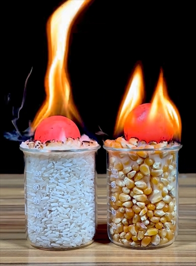 お米とトウモロコシの種の上に1000度の熱球を置く