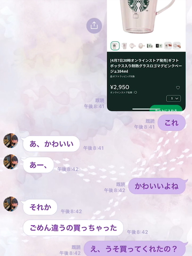すると、「ごめん違うの買っちゃった」という返答が。「え、うそ買ってくれたの?」と驚くLinoさんに、「ごめん透明じゃないわ」と返ってきました。タイムスタンプを見ると、Linoさんの最初の報告から1時間ほどの間に購入したことが分かります。これはまさしく“神対応”……!
