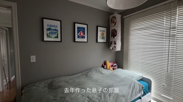息子くんの部屋は2024年に作られ、壁にはAlohaさんが好きなハワイ関連のイラストが飾られています。また、天井の角にはぬいぐるみが入れられた布製の収納も吊り下げられています。