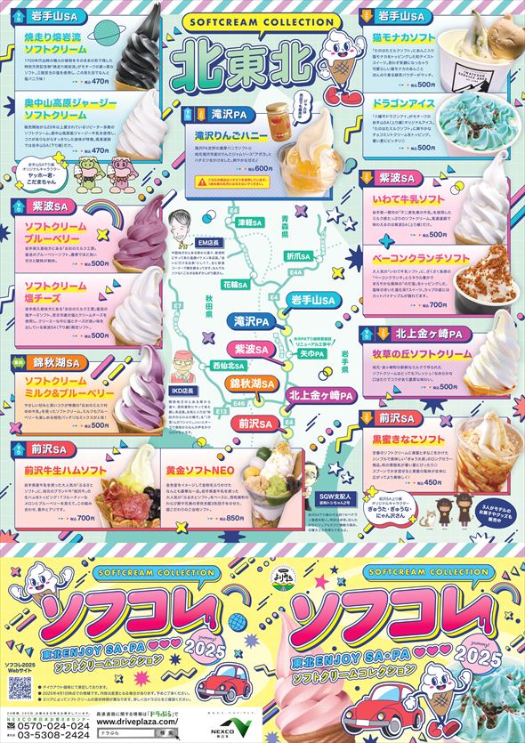 気温が上がってくるお出かけ日和のこの季節、冷たいものが食べたくなることも増えてくるでしょう。ネクスコ東日本エリアトラクトでは、東北地方のサービスエリア(SA)・パーキングエリア(PA)で販売されているソフトクリームをまとめたマップ「ソフトクリームコレクション2025」を4月25日から配布しています。