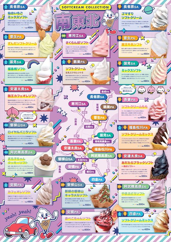 ソフトクリームコレクション(ソフコレ)は、地元食材を使用したソフトクリームや地域の名所をモチーフにしたものなど、東北地方のSA・PAの個性豊かなソフトクリームをまとめたマップ。