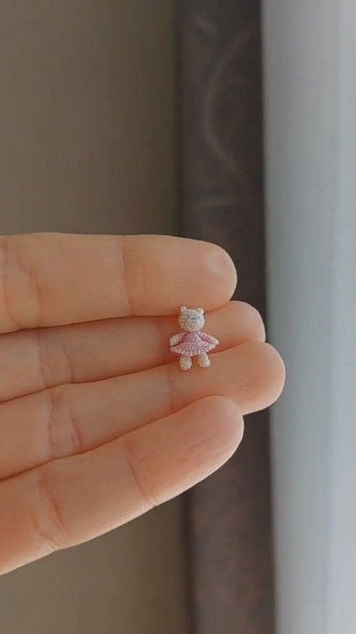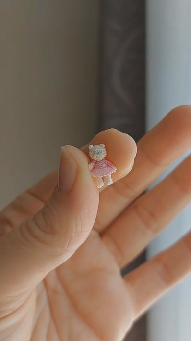 親指の先にすっぽりと隠れてしまうミニサイズながら、テディベアはピンク色の洋服を身にまとっていたり、あいらしい表情を浮かべていたりと、細部のディテールまで緻密に仕上げられています。じっと見入ってしまうクオリティーの高さに、多くの人が注目した投稿でした。