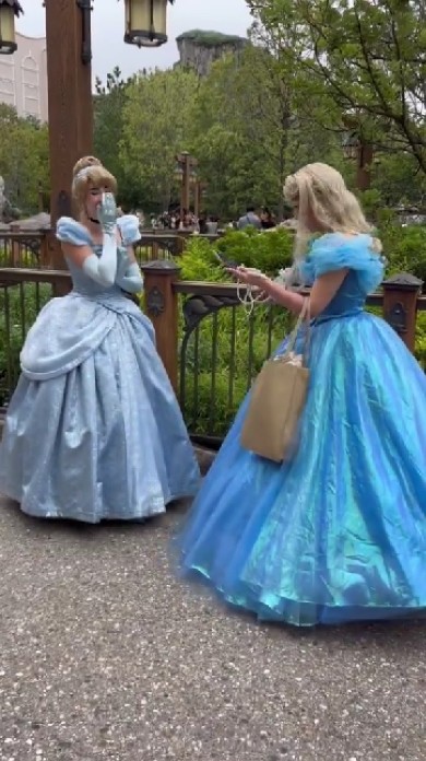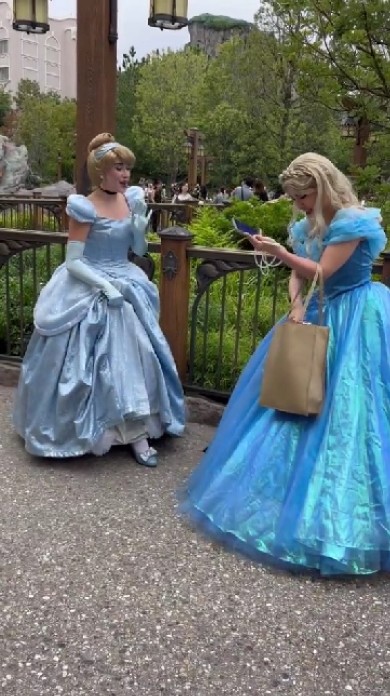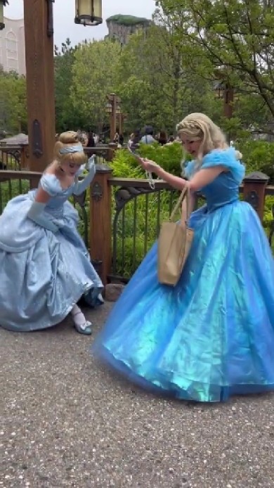 この日、みぃあさんは実写映画版「シンデレラ」をイメージした、美しいブルーのドレスと金髪のウィッグ姿で来園していました。現地では偶然にもアニメ版の“本物のシンデレラ”と遭遇し、夢のようなグリーティングが実現。優雅にガラスの靴を見せてくれるシンデレラに、みぃあさんもきっと感激している……かと思いきや、思わぬ行動に出ました。