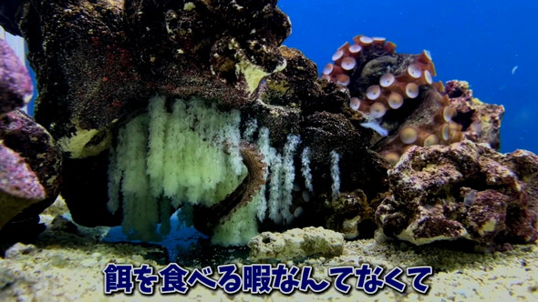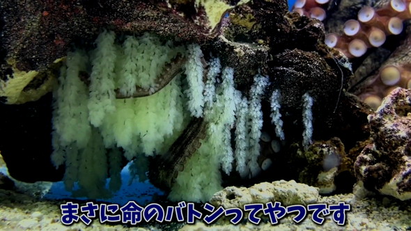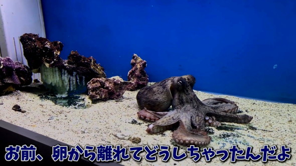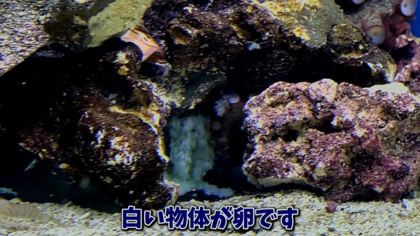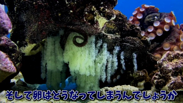 ある日緊急で動画を撮り始めたエマスさん。なんと、たこわさちゃんが卵を産んでいたのです。水槽内の岩の下には、たくさんの白い卵がぶら下がっています。食用になるはずだった売れ残っていたタコが卵を産むなんて……ビックリです!