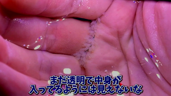 そんな作業の最中に、はぐれてしまった卵を発見。おそらくスジエビがちぎったのではないかと考えられます。エマスさんは透明で神秘的な卵を手に取って観察した後、たこわさちゃんが守っている卵のそばに返してあげました。
