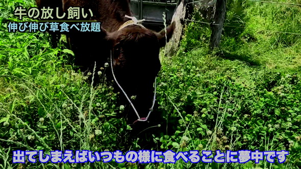 ですが初めての場所に緊張気味なのか、ハウスからはなかなか出てきません。そこで草を使っておびき出すことに。この作戦が見事成功し、牛たちはむしゃむしゃと草を食べ始めました。とても心地よいそしゃく音を聞かせてくれます。食べ放題の草と、柵内の安全と自由を満喫しているみたいです!