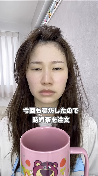 この動画をYouTubeに投稿したのは、驚きの“詐欺メイク”動画が人気の「足の裏から人間になるには」(@ashinoura_makeup)さん。今回紹介するのは、寝坊した朝にあっという間にメイクが完成する“時短茶シリーズ”の動画です。