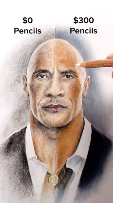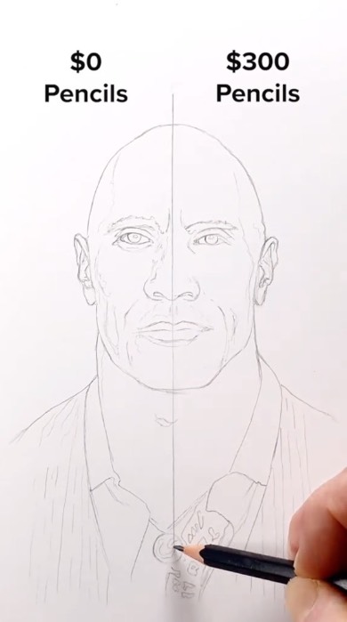 今回のモデルは、元プロレスラーで俳優のドウェイン・ジョンソン。まずドウェインの線画の中央に縦の線を引き、大きく2分割します。左側は「$0 Pencils」、右側は「$300 Pencils」という表記が。