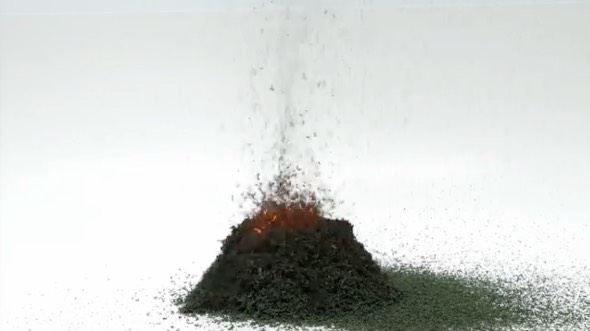 皿の上に出した重クロム酸アンモニウムに、バーナーで火をつけ、熱分解反応を起こします。重クロム酸アンモニウムは熱力学的に不安定な物質であり、一度熱分解反応が始まると、その場にある全ての重クロム酸アンモニウムが反応し終わるまで続くとのこと。火を吹きながらガスを生成しつつ反応する様子は、疑似火山噴火とも言われます。