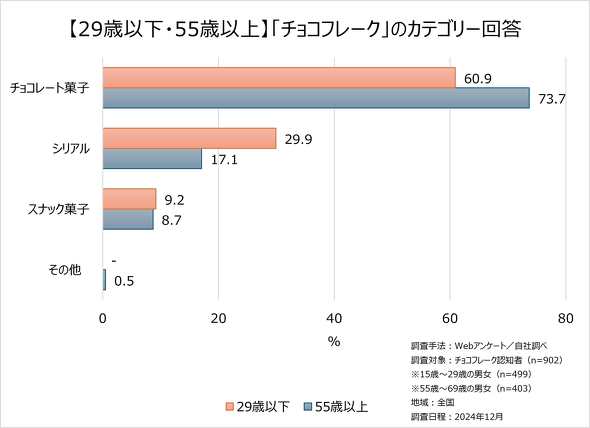 より細かい質問として、「知っている」と回答した人に「チョコフレーク」の商品カテゴリーを聞いたところ、正しく「チョコレート菓子」と回答できた人は、55歳以上で73.7%、29歳以下では60.9%という結果に。さらに29歳以下の人では「シリアル」と回答した人が29.9%となっており、令和の若者はその親世代と比較して「チョコフレーク」のことをあんまり知らない」という結果となりました。ヤングは食べてないのか、「チョコフレーク」。