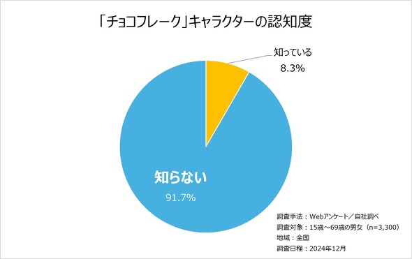 さらにちょっと寂しい結果となったのが、「チョコフレーク」のパッケージに描かれているキャラクター「チョコーン」の知名度。「チョコフレーク」みたいな見た目のキツネのキャラクターなのですが、この「チョコーン」に関しては91.7%の人が「知らない」と回答。商品を知っていると回答した人に限っても、「チョコーン」を認知している人は15.2%にとどまるという結果となりました。