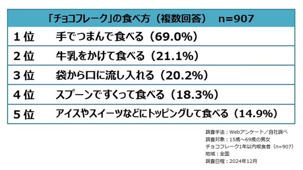 「チョコフレーク」の食べ方についての調査結果も興味深いものとなっていました。最も多かった回答は「手でつまんでそのまま食べる(69.0%)」でしたが、「牛乳をかけて食べる(21.1%)」「袋から口に流し入れる(20.2%)」「スプーンですくって食べる(18.3%)」「アイスやスイーツなどにトッピングして食べる(14.9%)」といった回答も寄せられました。