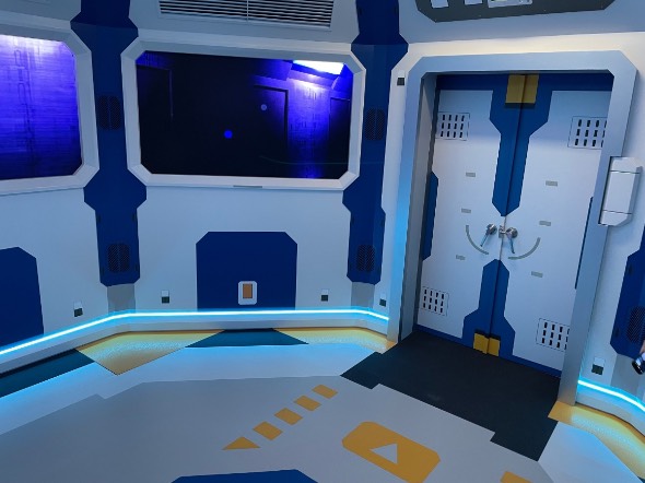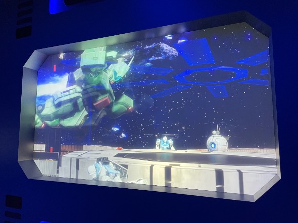 ということでエントランスを抜けると、軌道エレベーターへの入り口が並んだ搭乗ホールになっています。ここで旅のお供を務める2機のハロ「イークス」と「ポー」とご対面。来場者はエレベーター内に乗り込み、超高速で宇宙ステーションに向かうことになります。窓の外の風景が下に向けてかっ飛んでいくのと同時に地面がビリビリ揺れて、確かに垂直上昇してる感じがする。それにしても、軌道エレベーター要素が盛り込まれているの、「バンダイナムコは『Gレコ』のことを忘れてないぞ!」という意思表示を感じてアツいですね。ほら、ガンダムでマスドライバーじゃなくて軌道エレベーターが出てくるのってけっこう珍しいし……。『OO』にも『水星の魔女』にも出てきただろって言われちゃうと何も言い返せませんが。