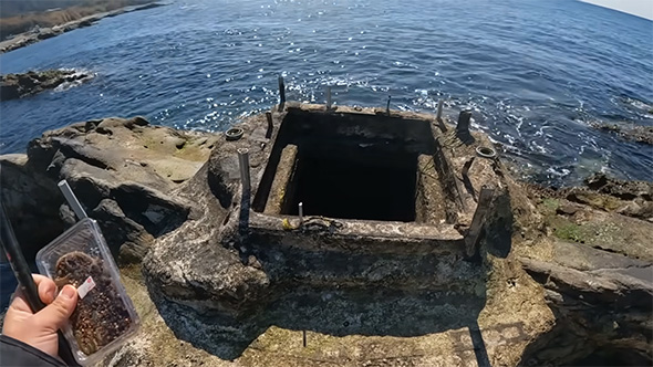 ぬこまた釣査団の隊長・大西さんがやって来た南房総の磯は、一見すると何の変哲もない磯のようです。しかし、海沿いには人工的に掘られたものと思われる“謎の穴”が点在していました。このような穴は、房総半島の内房、南房、外房で広く見られるそうです。