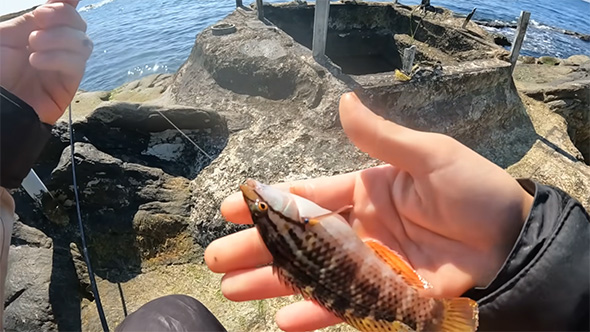 目視とカメラで穴の中を見てみると、魚が磯の隙間を行き来している姿が確認できました。しかし、どうにも警戒心が強そうなことから少し穴から離れ、長い竿を使って釣りをしてみると……ササノハベラやニシキベラなどが釣れました。