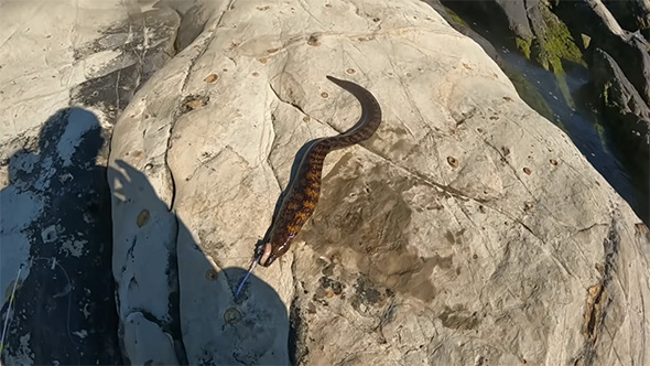 ダイソーで購入した穴釣りロッドを使い、エサに食いついたと思ったらすぐに逃げられてしまいましたが、再度穴にエサを投入して待つと……無事にウツボを釣り上げることに成功します。
