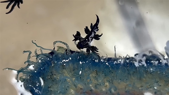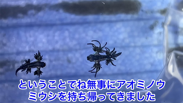 そしてしばらく探索すると、ついに探し求めていた「アオミノウミウシ」と出会うことができました。青くてとても美しい見た目のアオミノウミウシですが、食べたクラゲの毒を体に取り込んで自分の武器として使う習性を持つため、知識や準備もなく直接触るのはかなり危険で注意が必要です……! あらかわさんは細心の注意を払いながら回収に成功しました。