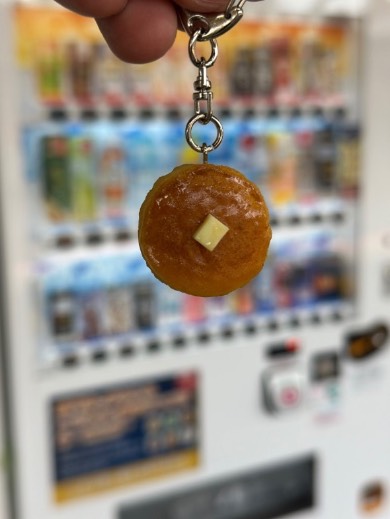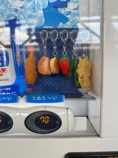 この自販機でドリンクと並んで売られているのは、なんと小さな食品サンプルのキーホルダー。確認できる範囲では、エビフライやみかん、パンケーキ、いちご、枝豆にさつまいもの天ぷら、といったラインアップのようです。ちなみにこの食品サンプル、お値段はボタンに表示されている「70円」ではなく、「700円」が正解とのこと。