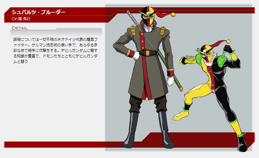 「機動武闘伝Gガンダム」に登場する、ネオドイツ代表のガンダムファイター。ドイツの国旗を模したマスクが特徴的で、ゲルマン流忍術を駆使した戦法を得意とします。