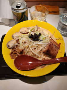 スタッフさんは1名いらっしゃり、カウンター内で忙しく働いていました。来店されるお客様への声掛けはなく、残念に感じました。また、席に座って食券を渡そうとしましたが、スタッフさんは忙しそうで、お客様への商品提供が終わるまで食券を渡せませんでした。