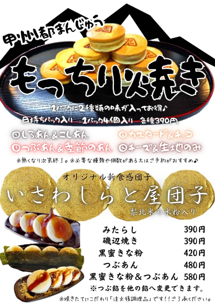 第2位は笛吹市の「石わ しらと屋」でした。石和温泉駅から徒歩2分のところにあるお店で、さまざまな味の甲州都まんじゅうを楽しむことができます。まんじゅう以外にもクレープ、ソフトクリーム、かき氷など種類豊富な甘味を販売しているのも特徴。観光で訪れるときにはぜひ立ち寄ってみたい名店です。