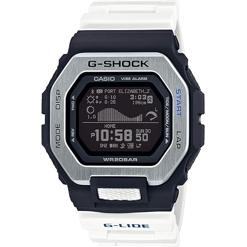 「G-SHOCK G-LIDE GBX-100-7JF」は、世界のトップサーファーから支持を受けるG-SHOCKのスポーツライン「G-LIDE」から登場した、スマートフォン連携機能搭載モデル。潮汐情報や日の出・日の入時間を専用アプリから簡単に設定でき、この他にもサーファーが必要とする機能が詰め込まれた1本です。機能面だけではなく、ステンレスと樹脂を融合したダブルガードベゼルを採用することで強度も確保。バンドには水や汗逃げを考慮したスリットが施され、快適なつけ心地が魅力です。
