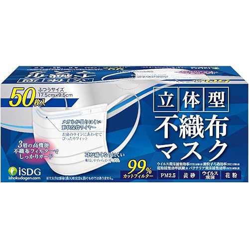 「医食同源 立体型不織布マスク」は、ウイルス飛沫、花粉、黄砂、PM2.5を99%カットする3層の高性能不織布フィルターを使用した、立体構造の不織布マスク。耳掛け部分には幅が広くやわらかい平ゴムを使用しているため、耳が痛くなりにくい仕様となっているほか、形状保持ワイヤーが鼻のラインにぴったりフィットすることで、メガネをしていても曇りにくいのがうれしいポイントです。