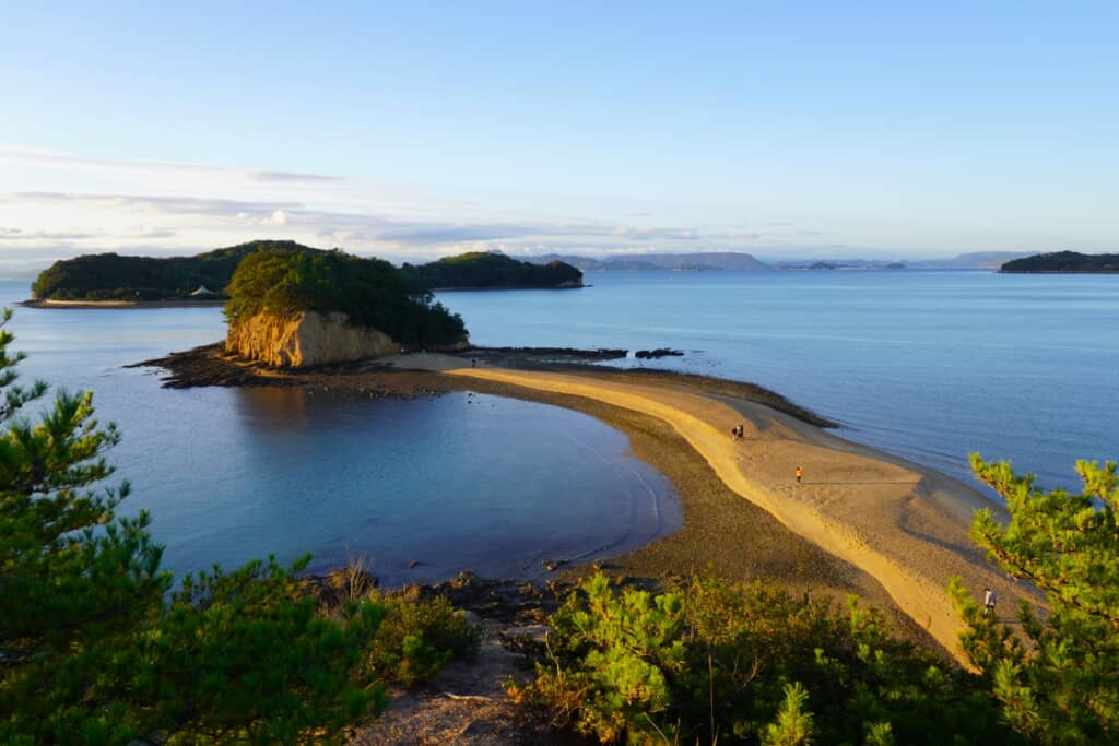 小豆島の星ヶ城連山の西側にある「四方指(しほうざし)展望台」に上れば、青い海の向こうに本州や淡路島を見渡せます。景勝地としては、引き潮の時間帯にだけ現れる砂の道「エンジェルロード」が有名です。