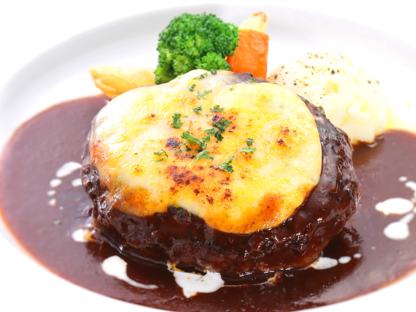 大館市にある老舗洋食屋「えんとつ」では、ホワイトソースがたっぷりとかかったハンバーグが評判のメニュー。ハンバーグはチーズとスタンダードの2種類があり、サイズは150グラムから400グラムまで5種類から選択可能。また、「和風ハンバーグ」も用意されています。