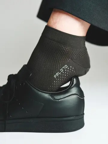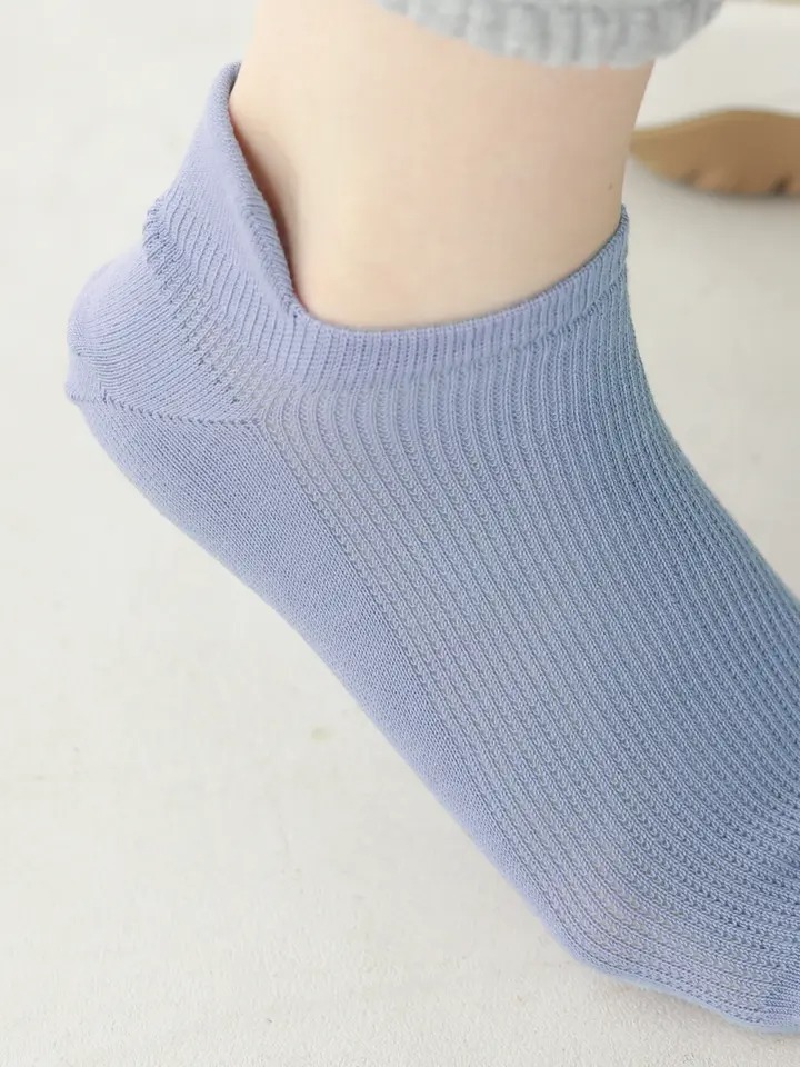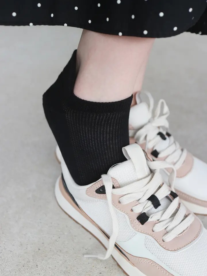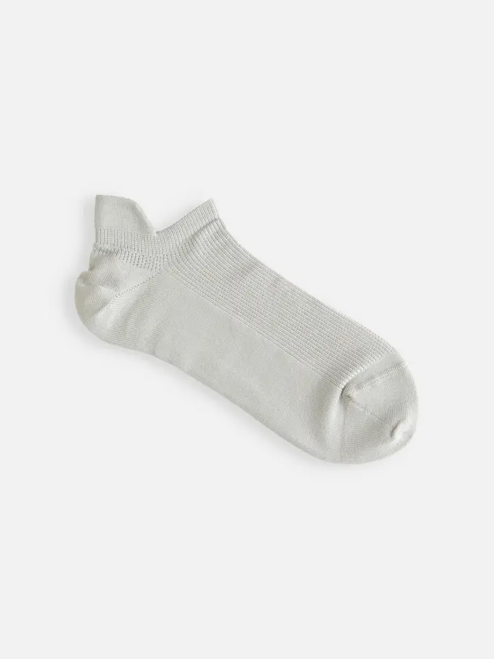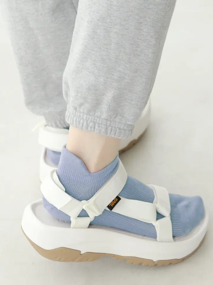 最大の特徴は、かかと部分に設けられた「アキレスガード」。スニーカーやサンダルが当たりがちな箇所をカバーしてくれるので、「くつ擦れに悩まされる…」という人にこそ試してほしいアイテムです。絶妙な高さのガードで、シューズのデザインを邪魔することなく、しっかり保護します。素材は綿を使用した薄手のメッシュタイプで、足を包み込むような優しいフィット感が特徴。通気性が高く、ムレにくくサラリとした履き心地をキープします。足首下の浅め丈で、スニーカーやスポーツサンダルとも相性抜群です。