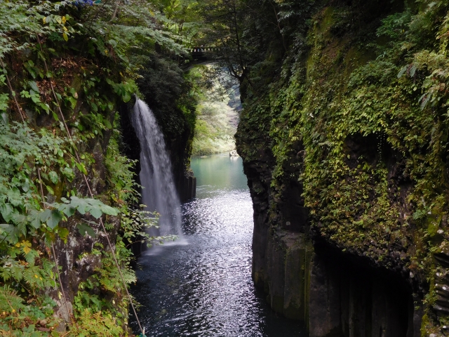 九州山地のほぼ中央部、宮崎県の最北端に位置する「高千穂(たかちほ)町」。国の名勝・天然記念物に指定されている「高千穂峡」があることで有名です。高千穂峡は阿蘇山の火山活動によって噴出した火砕流が冷えて固まり、浸食によって断崖絶壁となった峡谷です。貸しボートから「真名井の滝」を見上げれば、17メートルの高さから水が流れ落ちる迫力満点の景色を楽しめます。