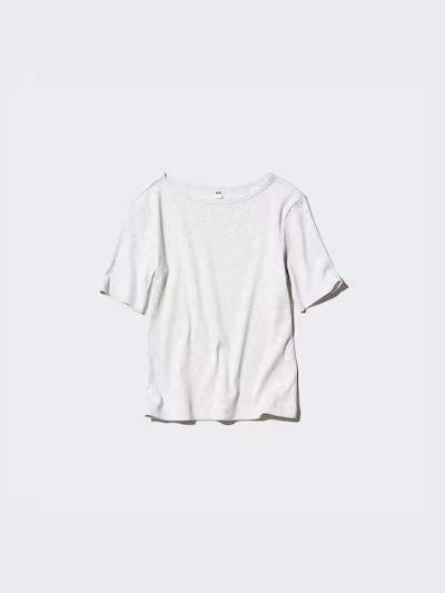 ユニクロの「リブボートネックT/5分袖」(990円・5月29日まで期間限定価格)は、二の腕を自然にカバーできる安心感のある丈感が魅力の一枚。襟元はボートネック仕様で首まわりをきれいに見せてくれ、カジュアルにもクリーンにも着こなせるため、幅広いスタイリングに対応します。