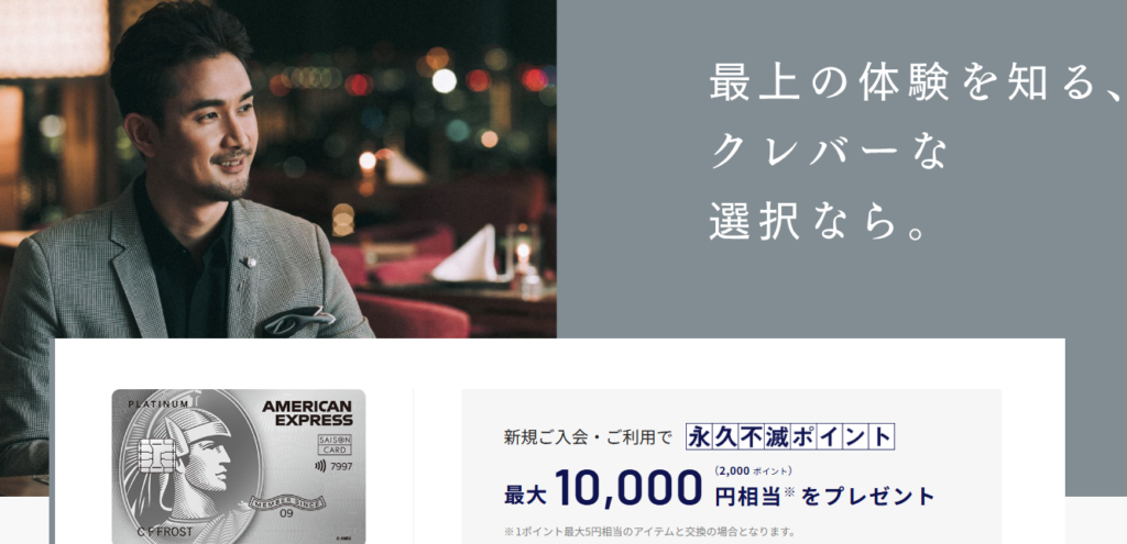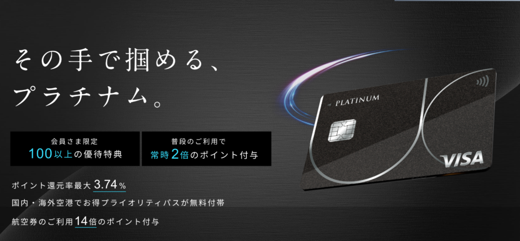 入会後3カ月以内に合計250万円以上のカード利用で4万のボーナスポイントをもらえるなど、さまざまな特典を用意しており、プラチナカード会員専用窓口「プラチナ・コンシェルジェ・デスク」を24時間365日いつでも利用できることも特徴です。