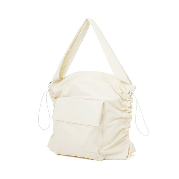 ジムの着替えやシューズ、一泊分の荷物までしっかり収納可能な大きめサイズなので、マザーズバッグや通勤バッグとしても活躍。両サイドにはドローストリング仕様の調整コードがついており、荷物の量やスタイルに応じてバッグの縦の長さを調整できるのがユニークなポイント。キュッと絞ればシルエットがコンパクトになり、カジュアルコーデにもぴったりハマります。