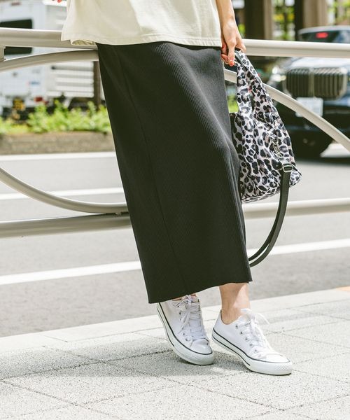 GLOBAL WORK(グローバルワーク)の「セルフCUTリブIラインスカート/288750」は、伸縮性の高いテレコカットソー素材を使用した、細見えするリブIラインスカート。裾から10センチまでは、好みの丈でセルフカットして長さを調整できるのがポイントです。
